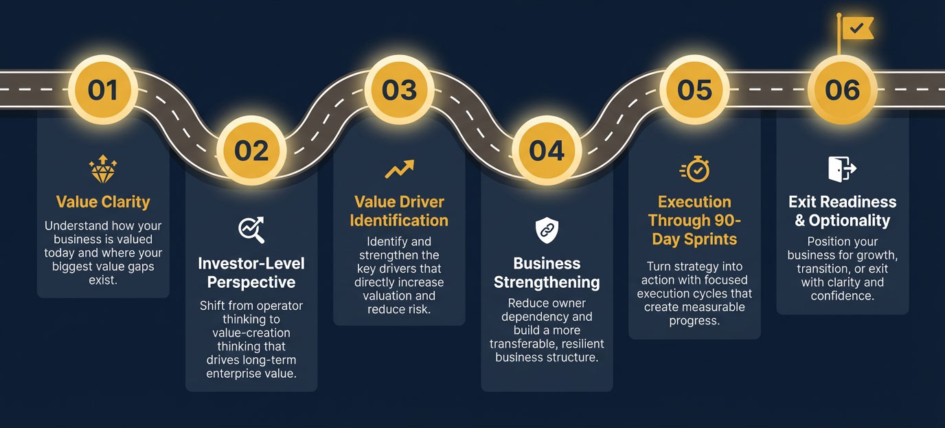 No guesswork. Follow a proven path that guides you through each phase of understanding, growing, and potentially selling your business with actionable steps at every stage.